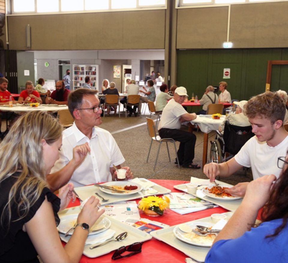 7,50 Euro kostet das Menü. Zu der Hauptspeise mit Fisch oder Fleisch gibt es immer auch eine vegetarische Alternative. Das Menü kann bis spätestens zum Vortag vorbestellt werden, die Helferinnen des DRKs nehmen die Wünsche vor Ort oder per Telefon unter 06232 600-223 entgegen. Auch gleich für mehrere Tage oder eine ganze Woche vorzubestellen ist möglich. Der Menüplan für die folgende Woche hängt in den Schaukästen vor „Q + H“ und auf dem Berliner Platz sowie im DRK-Kleiderladen in der Lessingstraße. Nicht nur GEWO-Mieterinnen und Mieter sind willkommen, sondern auch Berufstätige, die hier in ihrer Mittagspause etwas essen wollen, aber auch alle anderen aus dem Stadtteil, Jung und Alt.