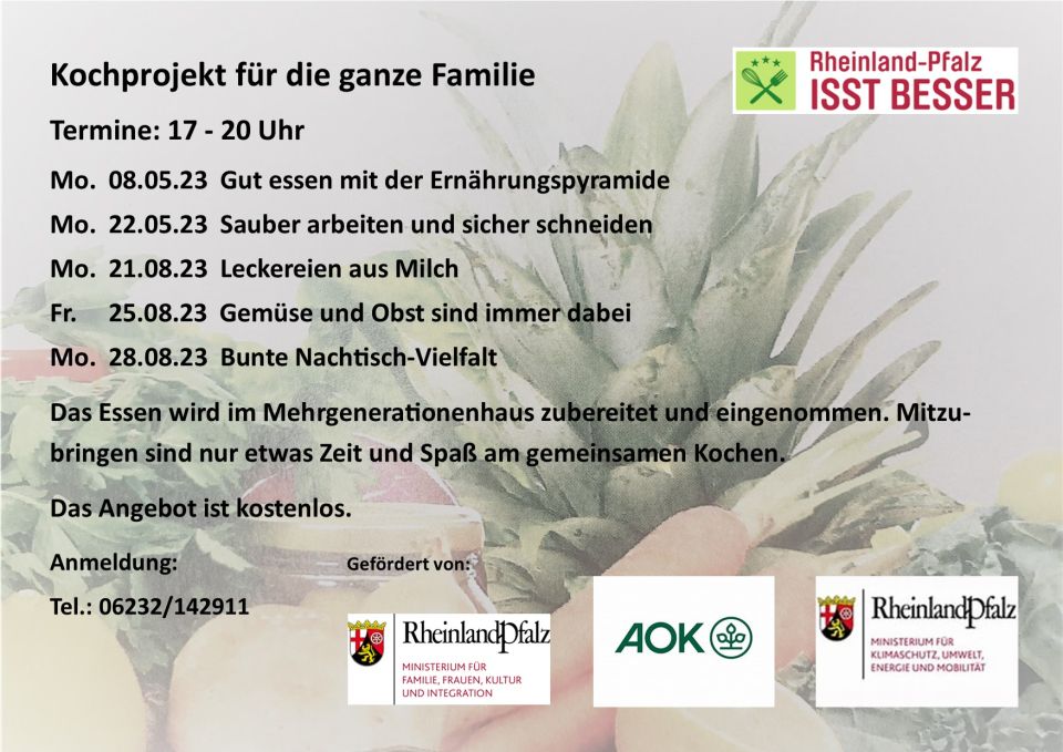 Das Kochprojekt für Familien wird vom Ministerium für Familie, Frauen, Kultur und Integration, vom Ministerium für Klimaschutz, Umwelt, Energie und Mobilität und der AOK gefördert.
