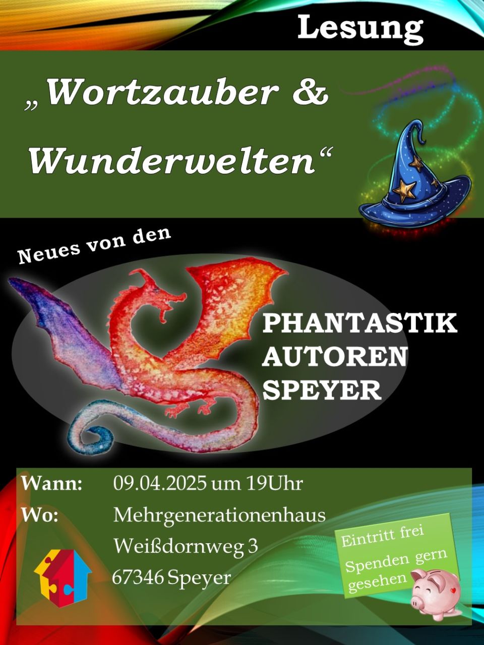 Wer Phantastik, Fantasy, märchenhafte Geschichten oder Krimis mag, dürfte auf seine Kosten kommen. Die Veranstaltung findet um 19:00 Uhr im Mehrgenerationenhaus Speyer, Weißdornweg 3, statt und ist kostenlos.“
